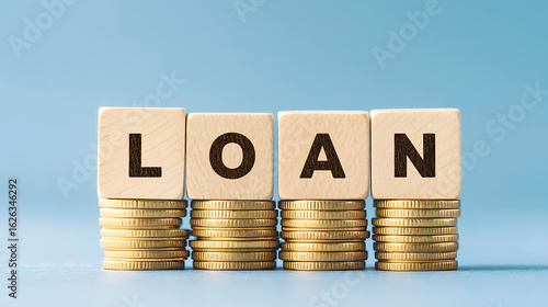 Wooden blocks spelling "LOAN" rest on stacks of gold coins against a light blue background, symbolizing borrowing and finance.
