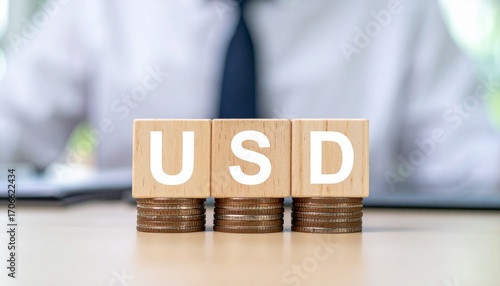 Wooden blocks spelling USD stacked on top of coins in front of an out-of-focus person