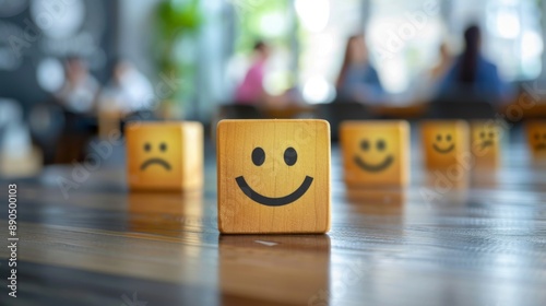 Wooden blocks with different facial expressions, depicting various emotions, are placed on a wooden table in a modern office environment.