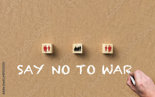 wooden blocks with soldier and people symbols and the message SAY NO TO WAR on paper background