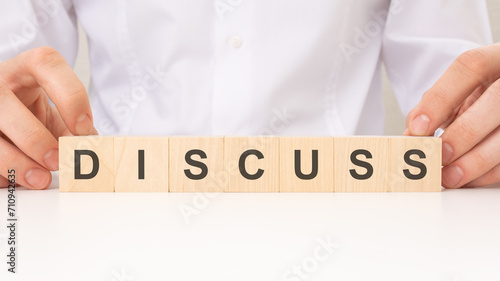 wooden blocks with text DISCUSS on the cardboard background. concept photo