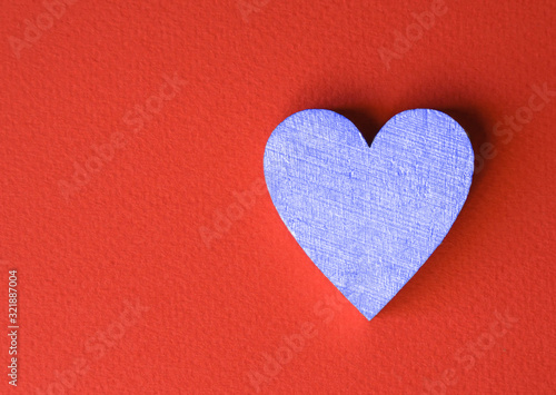 Wooden blue heart on a red background. Greeting card for Valentine's day. Declaration of love.