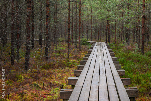 wooden boardwalk in swamp tourist trail with trees, resting area and sun rays in colorful summer weather
