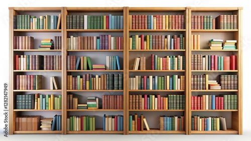 Wooden Bookcases Filled with Books on White Background
