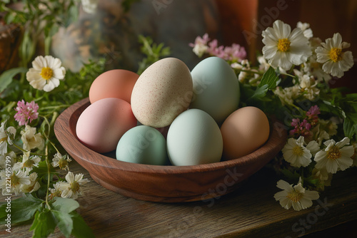 Wooden bowl with a dozen eggs in it. The eggs are white and pink. There are also some flowers in the bowl