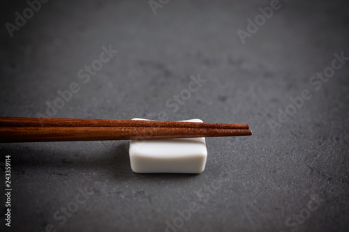 Wooden chopsticks and chopstick rest on black stone background. Close up. Copy space.
