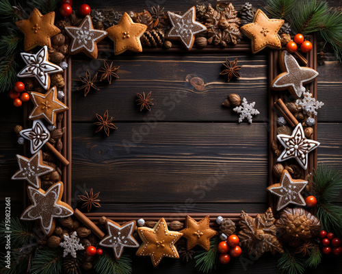 wooden christmas cookie frame on a wooden background, in the style of the stars art group сreated with Generative Ai