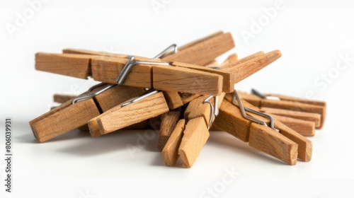 Wooden clothespins for attaching clothes to a rope on a white background.