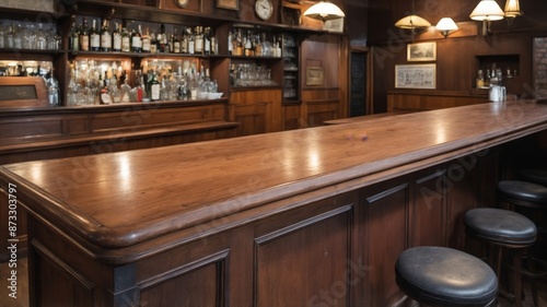 Wooden counter of an old bar from the 1950s, wooden bar in the background with drinks.