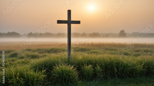 Wooden cross in a foggy field at sunrise, evoking a tranquil and reflective atmosphere