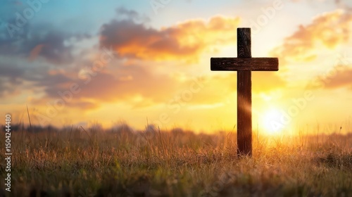 Wooden cross in twilight with light beams from heavens, sacred Christian symbolism