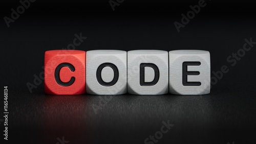 wooden cube block with CODE business word.close up of wooden elements,Business Concept.3D rendering on black background.