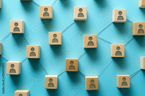 Wooden Cubes Network Blue Background, Social Connection Concept