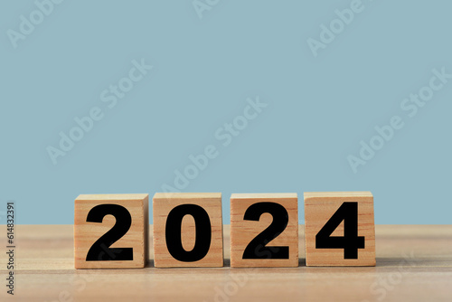 Wooden cubes with text 2024 on blue background with copy space for text, new year greeting card template.