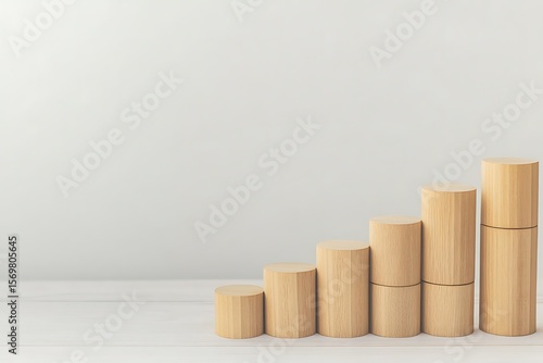 Wooden cylinders arranged in an ascending staircase pattern on a white surface