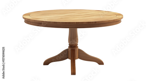Wooden dining table with a round top on a tripod base, white isolated background.
