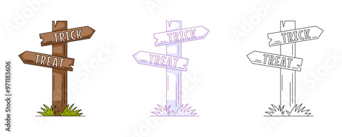 Wooden direction sign, pointer with phrase trick or treat, colorful and line icon set. Vector flat icon, monochrome purple, color, outline illustration. For logo, sticker, coloring book, label, print