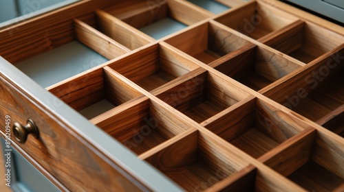 Wooden dividers in a drawer with a soft light blue interior, captured in portrait to highlight the detailed and organized space