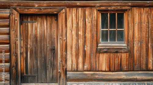 Wooden door and window on rustic log cabin wall showcasing natural textures and earthy tones in a historical architectural setting
