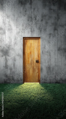 Wooden door set in concrete wall with light shining from beneath onto green grass creating a surreal and mysterious atmosphere with a dramatic perspective