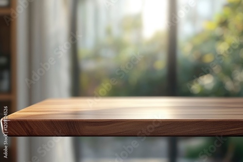 Wooden empty table in front, blurred cafe background. Bar counter key visual. Wood table top for presentation product. Restaurant table mockup. Cafe desk effect. Office space.