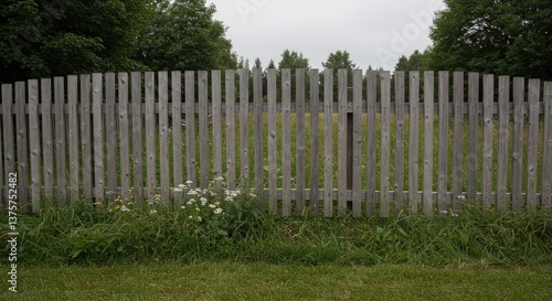 Wooden fence standing around a grassy field on a cloudy day in a rural area
