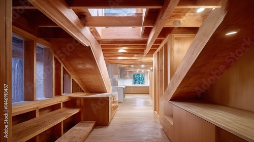 Wooden framing evolves into sleek kitchen cabinetry, blending raw structure with modern design in a diagonal composition.