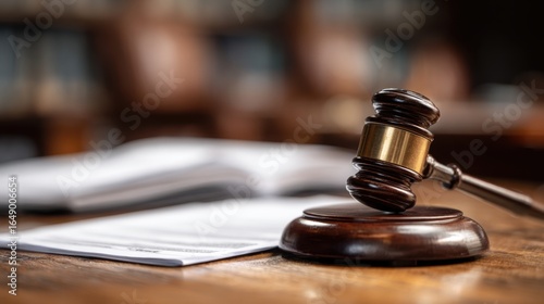Wooden gavel rests on a sound block next to a legal document, symbolizing justice and court proceedings, close up.