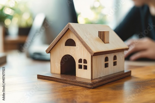 Wooden House Model on Desk in Bright Office Setting with Person Using Computer and Natural Light