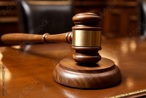 Wooden judge's gavel on a table in a courtroom. Generative AI