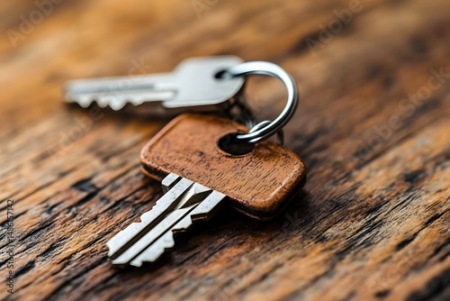 Wooden Keyring Keys: Close-up of two metal keys with a wooden key ring charm resting on a rustic wooden surface. The image conveys a sense of security, ownership, and new beginnings.