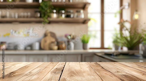 Wooden light empty tabletop against the background of a modern kitchen in light brown tones, kitchen panel with accessories. Scene showcase template for promotional items, banner, copy space