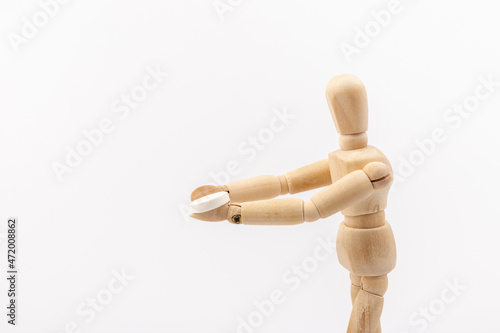 Wooden mannequin with pills on white background. Concept of pharmaceuticals and supplements.