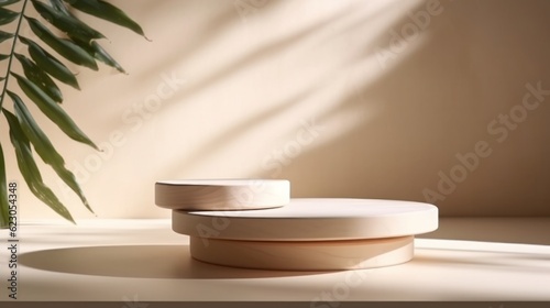 wooden natural blank stage tray backdrop showcase exhibit template on white table top with shadowshade of tree leaf on background wall,ai generate