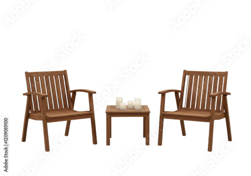 Wooden outdoor seating set with two chairs and a small table with candles, isolated on white background