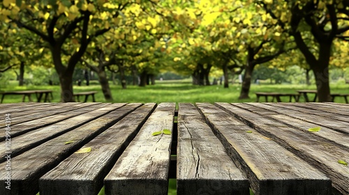 Wooden picnic table with blurry background of trees for product placement mockup Light Gradient Background with Room for Typography