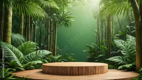 Wooden podium in tropical jungle. Empty stage for product display.