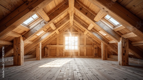 Wooden Roof Framework of New House with Visible Beams and Panoramic View on a Sunny Day