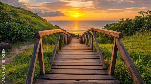 Wooden staircase leading to GRemovedine Island surrounded by green grass and trees, sunset glow over sea, panoramic view of endless seaside, warm colors, high resolution.