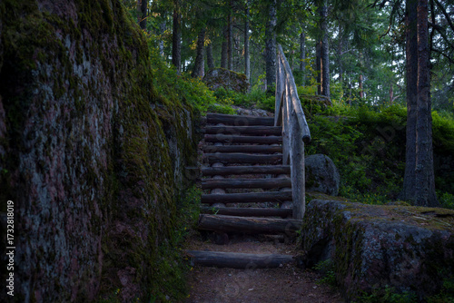 Wooden stairs with rustic railing in dense summer forest