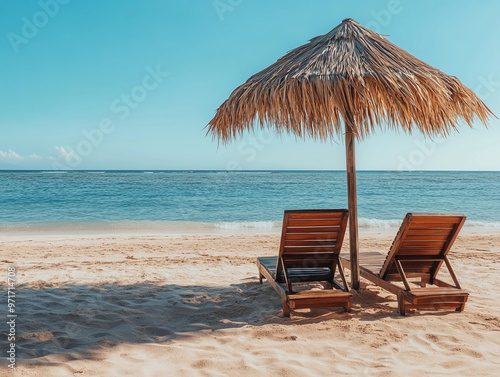 wooden sun lounger on a luxury resort's private beach, under a large thatched umbrella, bright midday sun