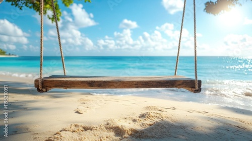 Wooden Swing with Copy Space on a Tropical Ocean Background