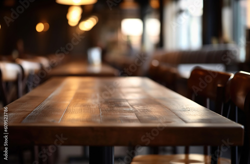 Wooden table blurred background of restaurant of cafe with bokeh. Generative AI