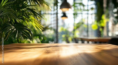 Wooden table for displaying products or advertising with a background of leaves, trees and natural plants in the living room. product display and background advertising