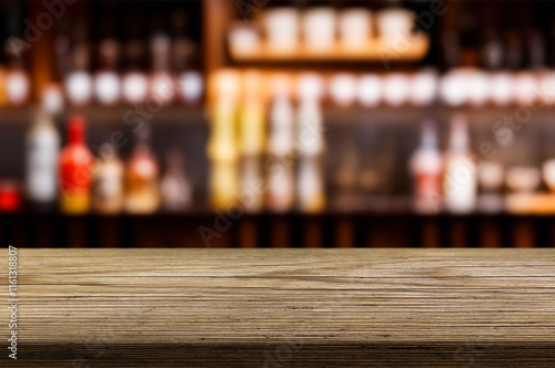 wooden table for placing products with a beautiful night restaurant backdrop, Space for placing items on the table, product and food display.