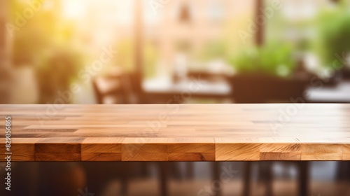 Wooden table for product presentation on blurred kitchen background. Generative AI.