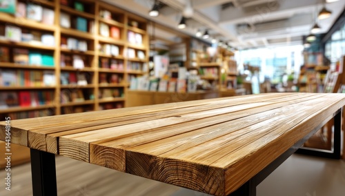 Wooden Table in a Bookstore: A close-up shot of a well-crafted wooden table set against the backdrop of a bustling bookstore.