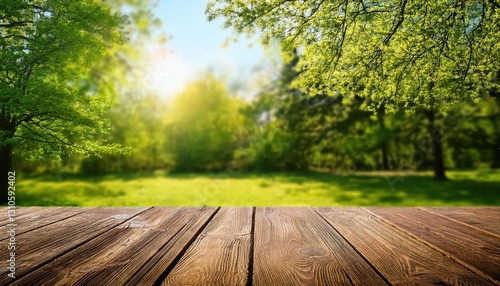 Wooden Table in Blooming Spring Park under a Sunlit Canopy of Green Trees, Capturing the Vibrant Beauty and Serenity of Nature on a Sunny Afternoon.