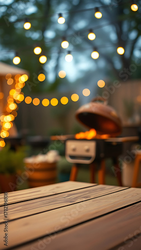Wooden table in foreground with blurred garden barbecue and string lights in background
