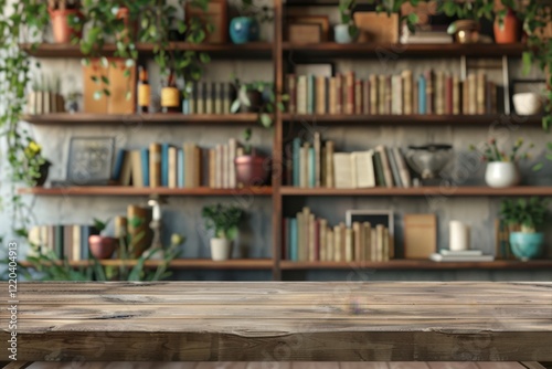 Wooden Table in Front of a Cozy Home Library with Green Plants